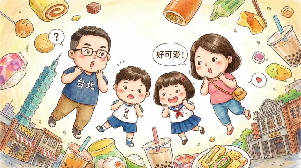 一家四口的 Q 版人物插畫,透過髮型、臉型與表情展現個人特徵,也融合台北特色場景。圖/AI 生成